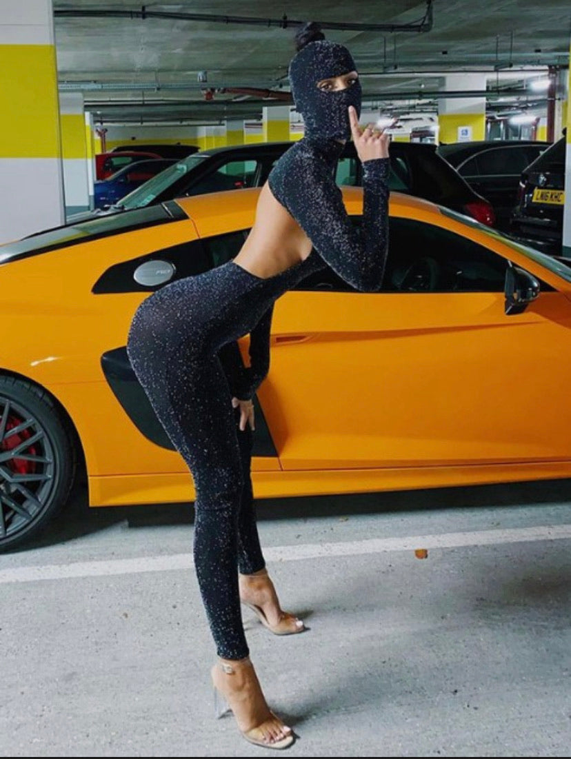 This sparkly jumpsuit is paired with an amazing headpiece. It’s adds just enough drama! Made of 95% of stretchy polyester
